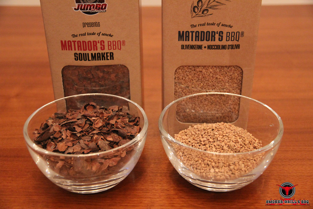 Es geht hier um einen Test von Smoking Chips in der Geschmacksrichtung „Soulmaker“, was aus Kakaoschalen besteht und „Nocciolino D’Oliva“Olivenkerne. Das kannten wir bis dato noch nicht und waren Feuer und Flamme auf die von Matador´s BBQ bereit gestellten Köstlichkeiten. Mittlerweile sind Holzchips, Räuchermehl und Chunks ein fester Bestandteil der Grillgutoptimierung, warum auch nicht Kakao und Oliven. Auf zum Test.